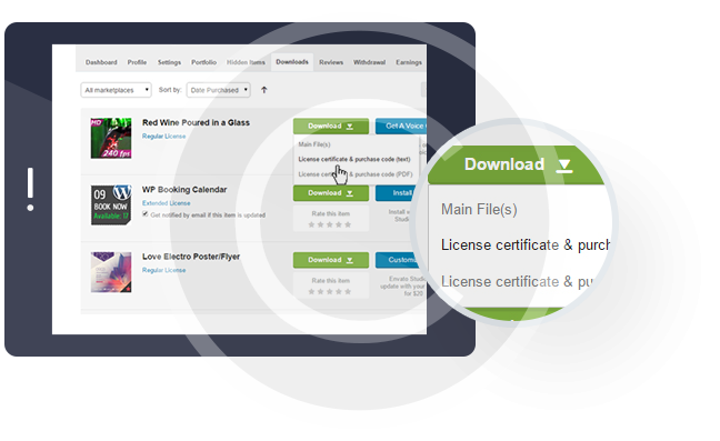 - Click „download“ button, and in the drop-down menu select „license certificate & purchase code“.